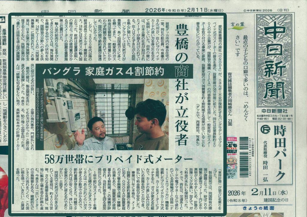 2026年2月11日(水)付の中日新聞朝刊にて、弊社がバングラデシュで取り組む一般家庭向けプリペイドガスメーターの普及事業について掲載いただきました。